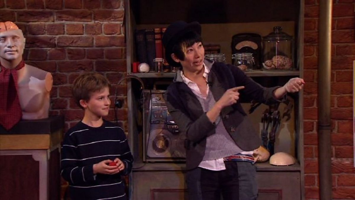 Magician Billy Kidd does a magic trick with red foam balls. She calls a member of the audience up, repeats the trick and tells them how she is doing it. In the trick she makes a foam ball disappear and reappear in the child's hand.