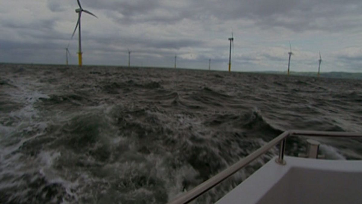 Footage of North Hoyle Offshore Wind Farm, off the coast near Rhyl in North Wales with a close up of the turbines. Discussion on future of wind power.