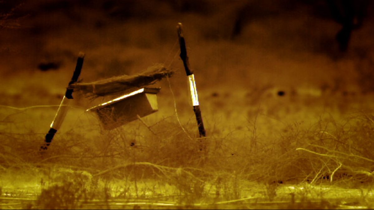 Peter Ekerri keeps over a hundred bee hives at his farm. They are wired together so that if one is knocked, all will swing and the bees will go wild - scaring off elephants that would otherwise destroy Peter's crops.