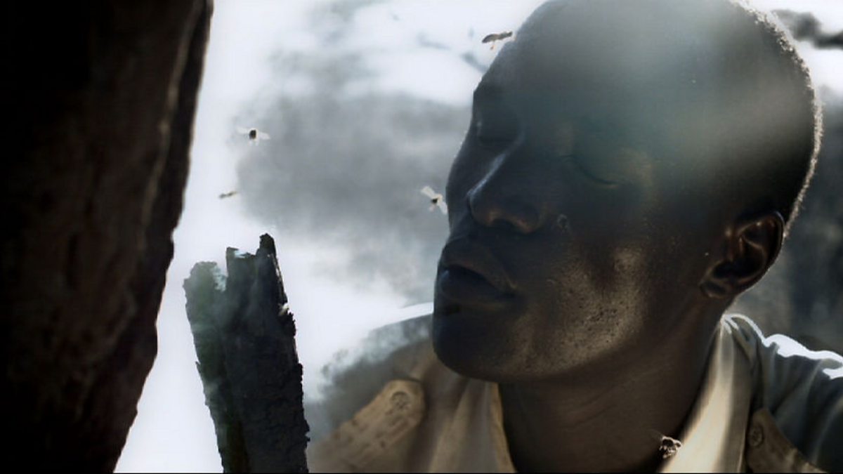 A bee-eater gives the location of a wild honeybee colony away. A local tribesman uses smoke to drug bees so that honey can be taken from their hive.