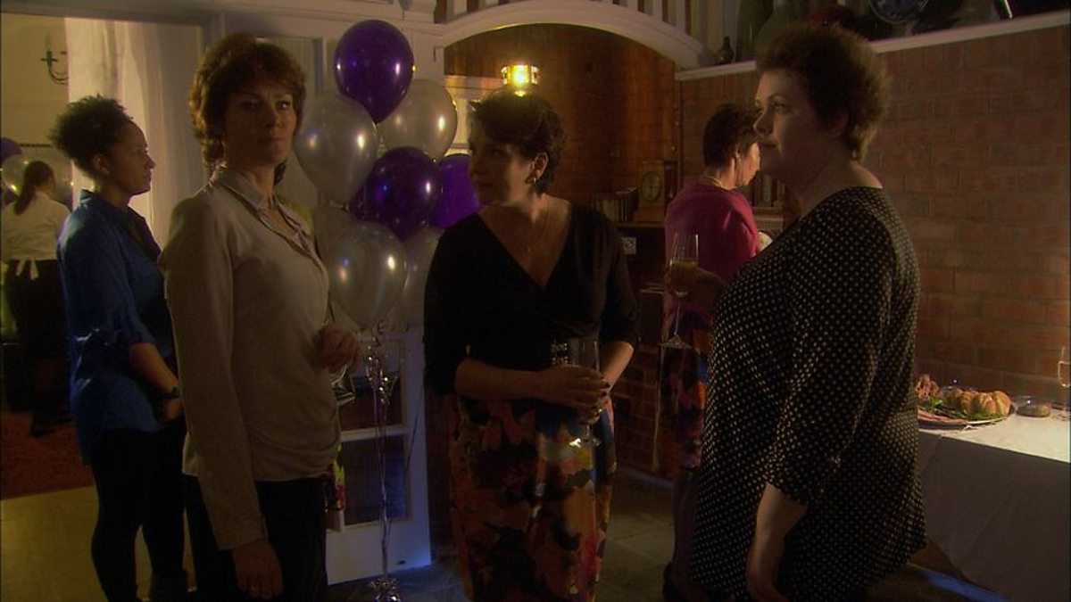 Karen's dinner party becomes very popular after the details are unwittingly put on a social networking site. Karen makes a stand and then tries to distract her guests from the chaos outside by doing a speech but ends up getting covered in water.