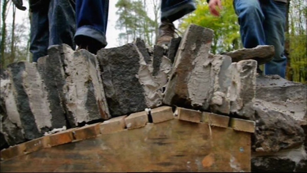Charlie Luxton returns to site to help the builders remove the wooden support upon which the vault of the undercroft has been built. A real test of the stonemason's work.