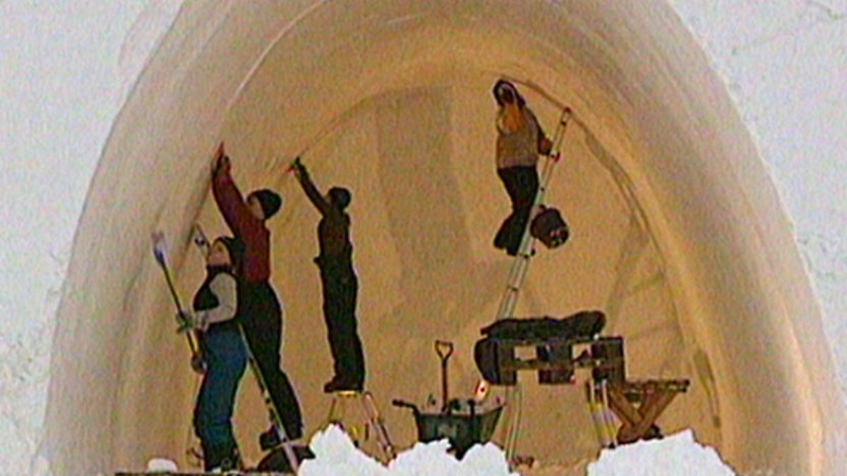 Footage showing the building of a hotel in northern Sweden that is made completely out of snow and ice. Shows ouside wall and inside rooms including bar and bedrooms.