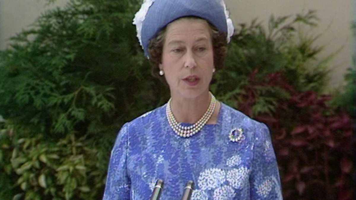 Queen Elizabeth II addresses an audience in the New University of Ulster at Coleraine. Her Majesty visited the campus on the second day of her 1977 Silver Jubilee visit to Northern Ireland. Despite an Irish Republican Army bomb having exploded at the campus the day before, the Queen stated: “There are hopeful signs of reconciliation and understanding. Policemen and soldiers have told me of the real co-operation they are receiving. I have sensed a common bond and a shared hope for the future.”