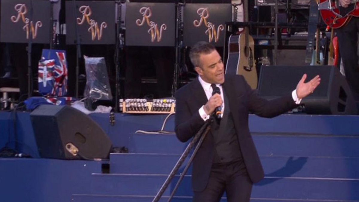 Robbie Williams performs Mack The Knife at the Queen’s Diamond Jubilee Concert from Buckingham Palace.