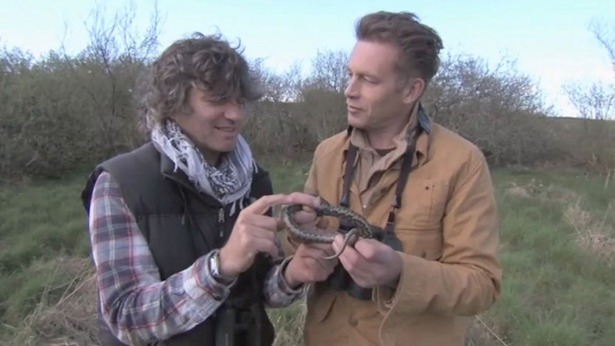 Chris Packham and Martin Hughes Games look for snakes around Velvet Bottom