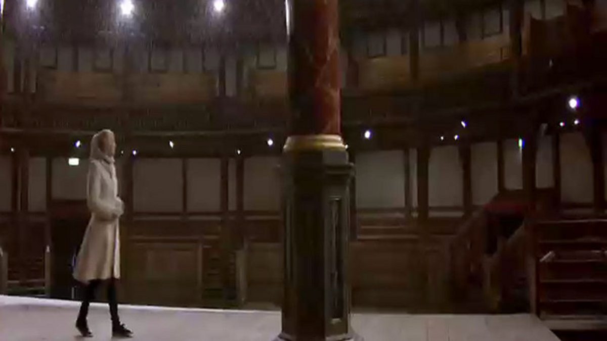 Joely Richardson wanders around an empty Globe theatre, talking about what a Shakespeare performance would have been like 400 years ago in such a place. She imagines the heckling, laughing, cheering the actors would have been dealing with and how this would have added to Shakespeare's plays. As she does this the snow starts to fall and she momentarily has to stop and wonder at the beauty of it.