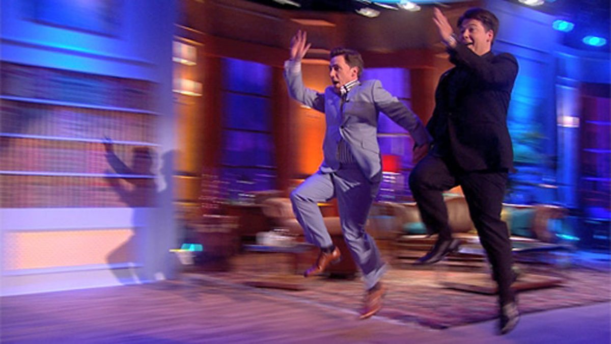 Rob Brydon asks Michael McIntyre about the impression his children do of his skipping. Michael shows Rob how to do combine walking and skipping to make ‘fly skipping’.