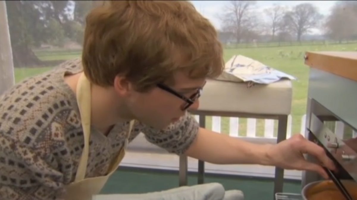 One of the new bakers, James, is facing a possible disaster during his first challenge. While everyone around him is turning out their cakes, his is still baking.