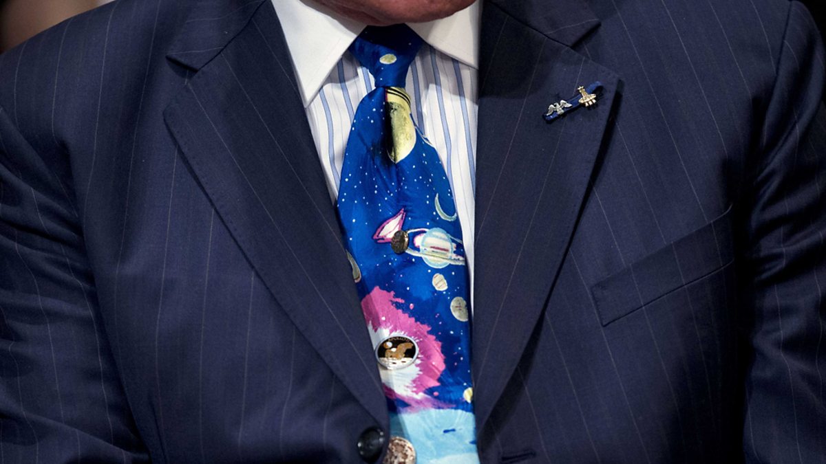 (Image: Former astronaut Buzz Aldrin wearing a tie with space designs. Credit: REUTERS/Evan Vucci/Pool)