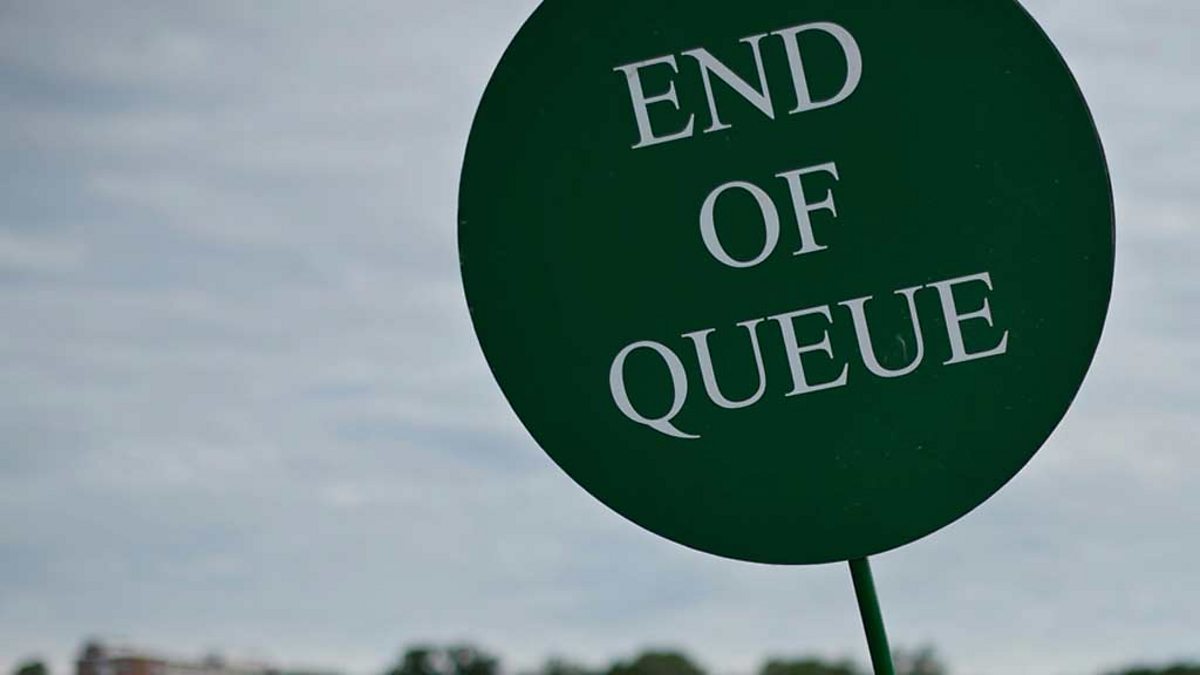(Image: A steward holds a sign that says 'end of queue'. Credit: BEN STANSALL/AFP/GettyImages)