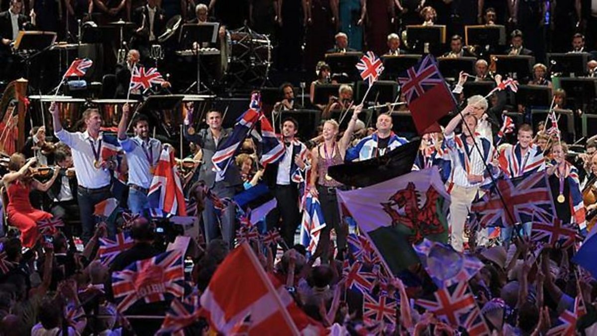 Audience, choirs, tenor soloist Joseph Calleja and special guest Olympians sing along to Rule, Britannia!, from Proms founder Sir Henry Wood's Fantasia on British Sea Songs.