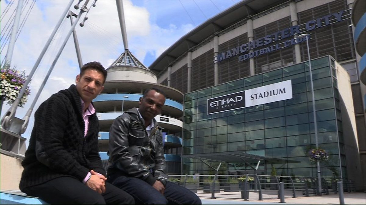 Memnos Costi and Ahmed Mudawi enjoy a day out at Manchester City's Etihad Stadium and take their seats in the Manager's dugout.