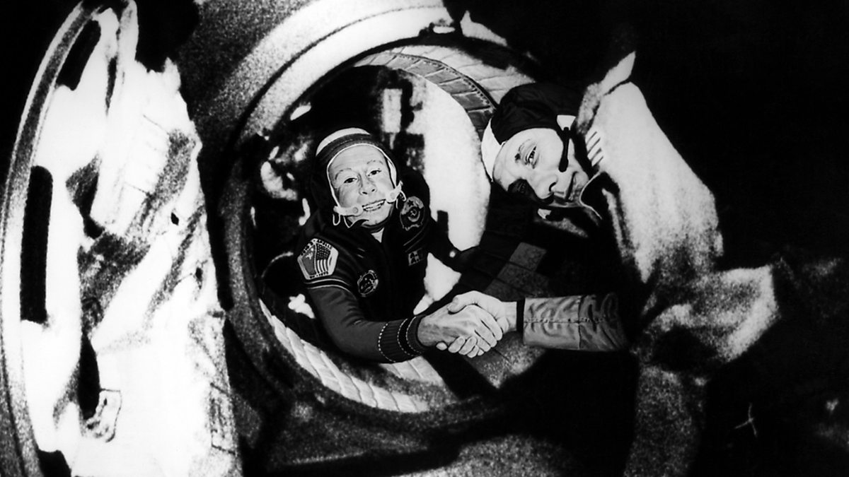 American and Soviet astronauts Thomas Stafford and Alexei Leonov's symbolic handshake, and Alexander Solzhenitsyn's untimely intervention about the realities of the USSR.