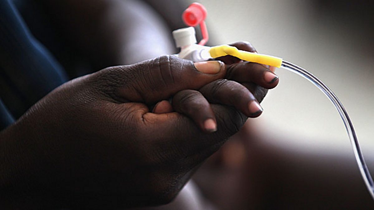 (Image: An adult's hand and a child's hand with a cannula, Credit: Getty Images)