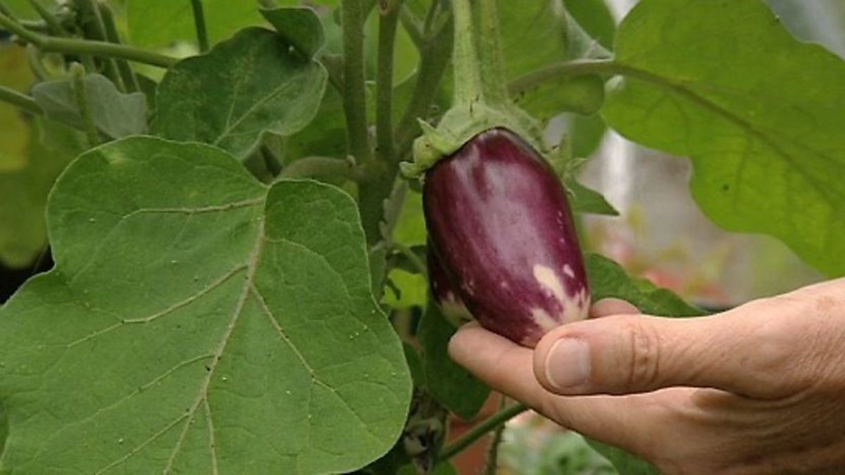 George puts some grease bands round the apple trees to keep pesky winter moths at bay. Carole checks the progress of the mini aubergines and finds a bit of heat has made all the difference.