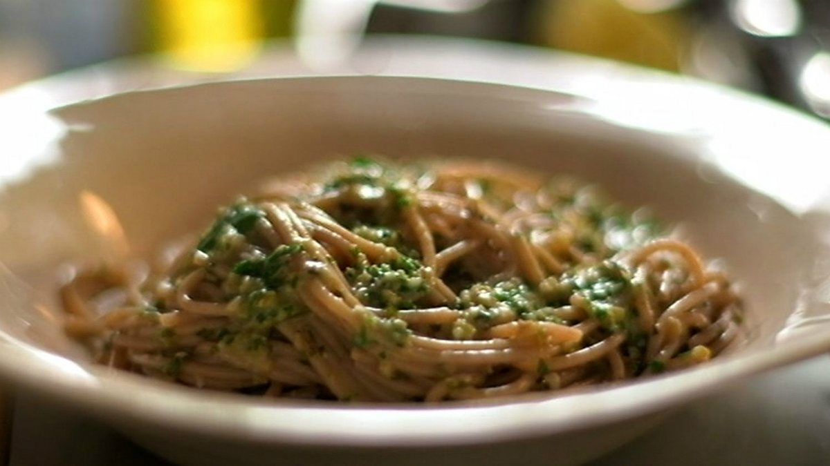 To make it you'll need: spelt spaghetti, green olives, anchovy fillets (from can or jar), garlic, lemon, pine nuts, parsley.