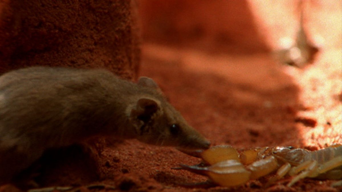 The narrow-nosed planigale is one of Australia's smallest marsupials, and one of the toughest. Most of its meals are larger than it is, and will include scorpions and huge moths. In the underground cracks in which it shelters, it is almost 15 degrees cooler than out in the sun of the desert, but snakes are a constant threat. The inland taipan, for instance, is the world's deadliest snake and often slithers through the crevices in search of a meal.