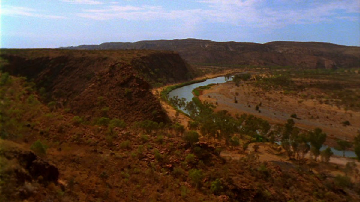 Rain in the Australian desert forms into rivers, channelled by the mountains. The Finke River has been cutting its course out of Australia's central ranges for nearly 300 million years and is thought to be one of the oldest rivers on earth. It does not flow to the sea but heads inland, further into the desert. Along its 700 kilometre route it transforms the dry lands beyond the mountains, providing precious water holes. And even when the water is not apparent on the surface, trees can reach the water that has seeped underground.