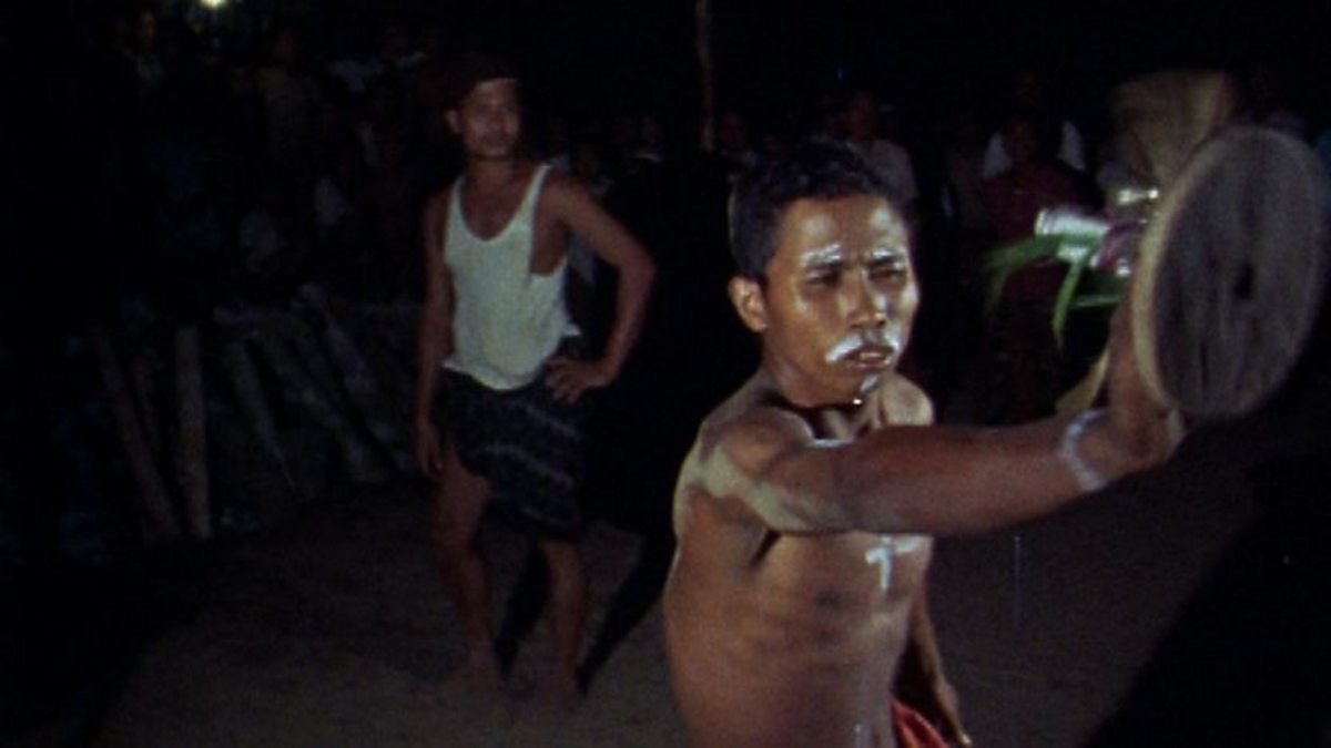 During a Balinese ceremony, one man goes into a state of trance and finds himself possessed by the spirit of a pot lid.
