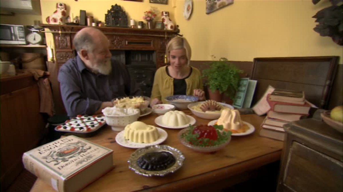 Peter Brears and Lucy Worsley discussing puddings from Food in England