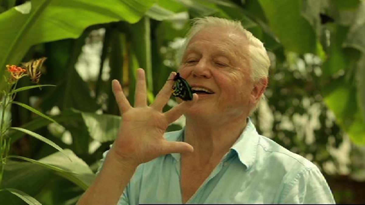 David Attenborough with a Priam’s Birdwing Butterfly.