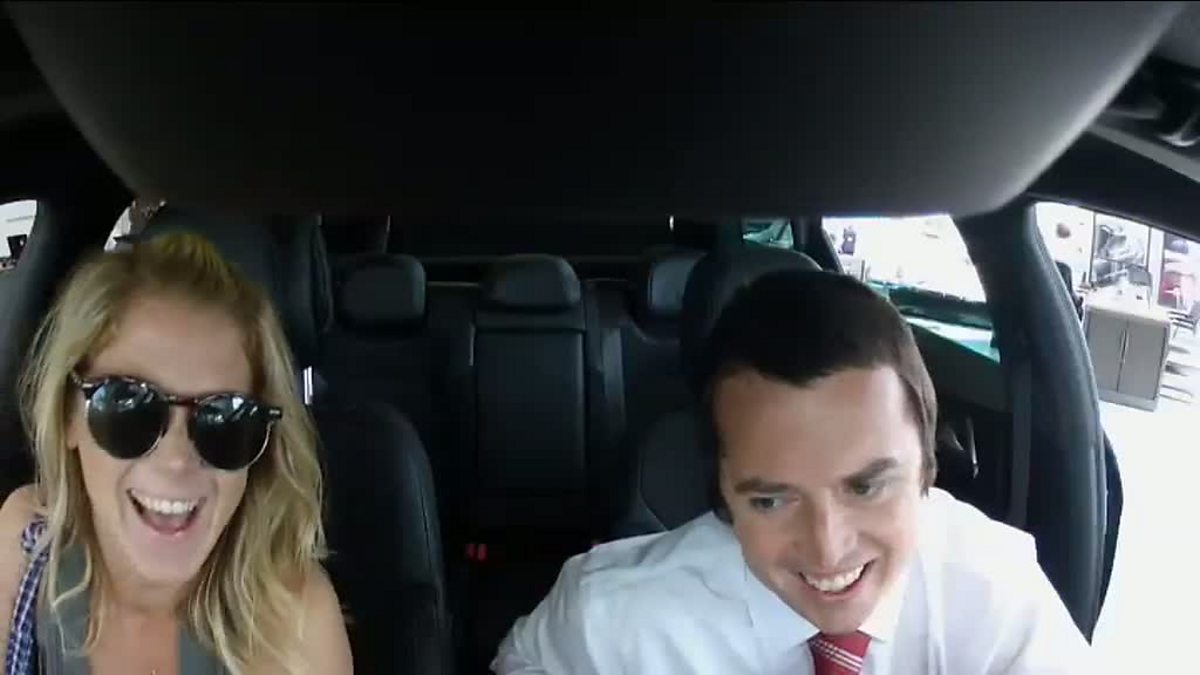 In the car showroom, each of our Impractical Jokers took it in turns to try and coax a member of the public to test out the boot of the car. Here our Paul gets fired up to burn some serious rubber.