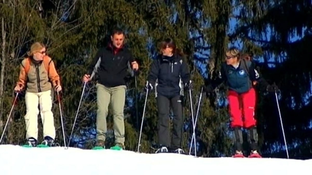 A group of friends go on a snowshoe expedition in the Alps. They are interviewed about where they come from, how long the activity takes and other activities they take part in.