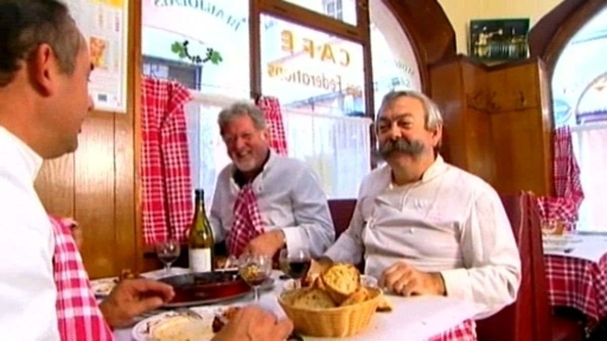 Café des Fédérations, is a bouchon in Lyon. A bouchon is a type of restaurant that serves traditional Lyonnaise food. The term 'bouchon' is explained as a word to describe the ambience or convivial feel of the place. The interviewer talks to the patron and three chef friends about the origins of Lyonnaise cuisine, favourite foods and their individual specialities.