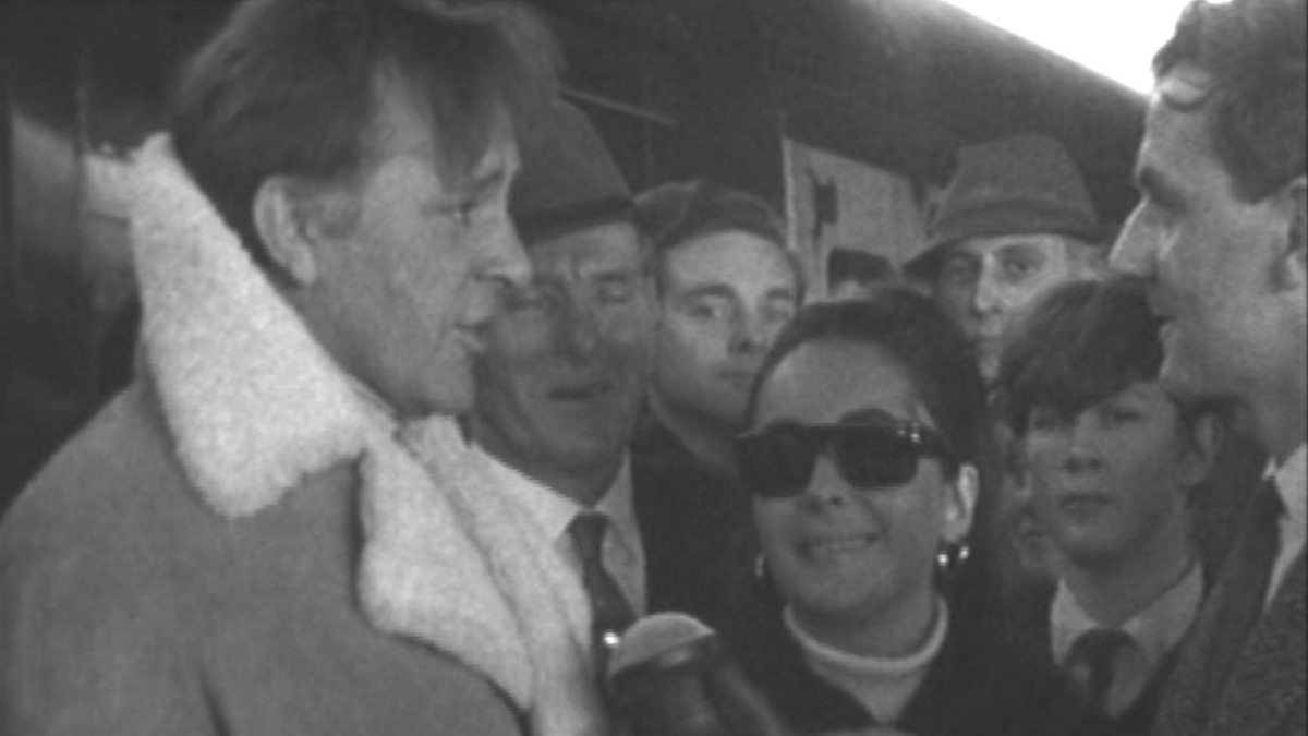 Richard Burton and Elizabeth Taylor are interviewed at Cardiff railway station by Brian Hoey for Wales Today in 1965. The couple were in Wales for the Wales vs England rugby match.