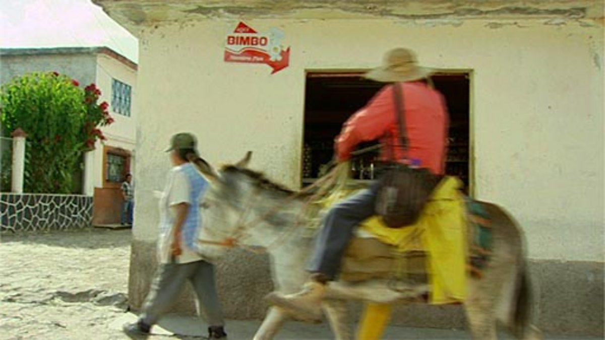 Barnaby Bear continues his visit to the Mexican village of Tocuaro. Barnaby accompanies his pen pal Juan Pablo and Angelica on a shopping trip to the Tortilleria to buy some dough for making tortillas. The dough is made from crushed corn or maize. Back at Angelica's Barnaby helps to press the tortilla dough ready for cooking.