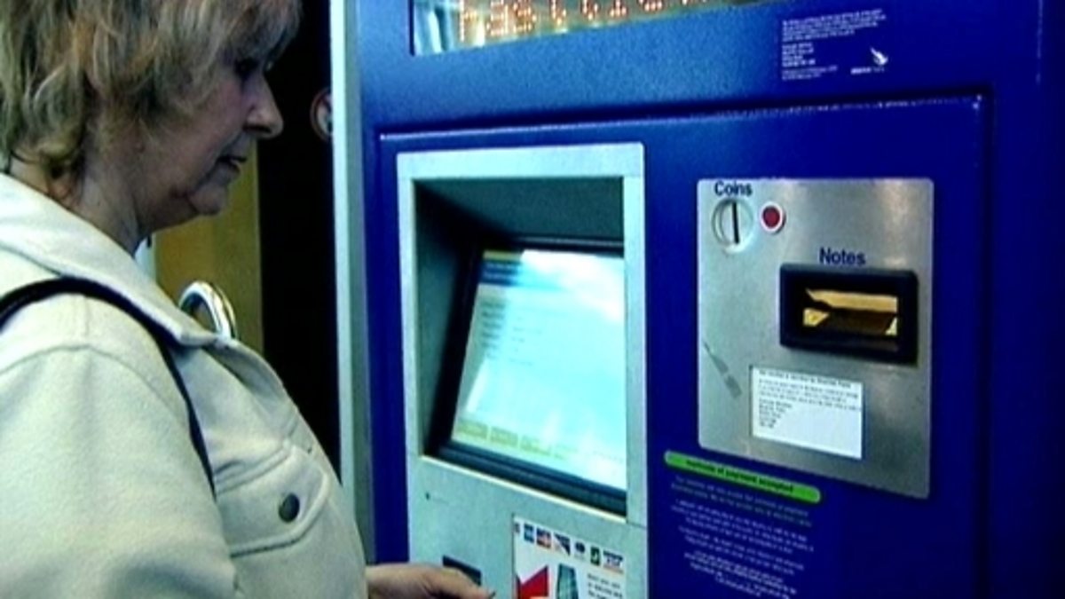 How to calculate the change due from a five pound note when buying a train ticket. The ticket costs £2.20 and a five pound note is paid into the ticket machine. The machine rapidly calculates the change due and £2.80 is returned to the traveller.