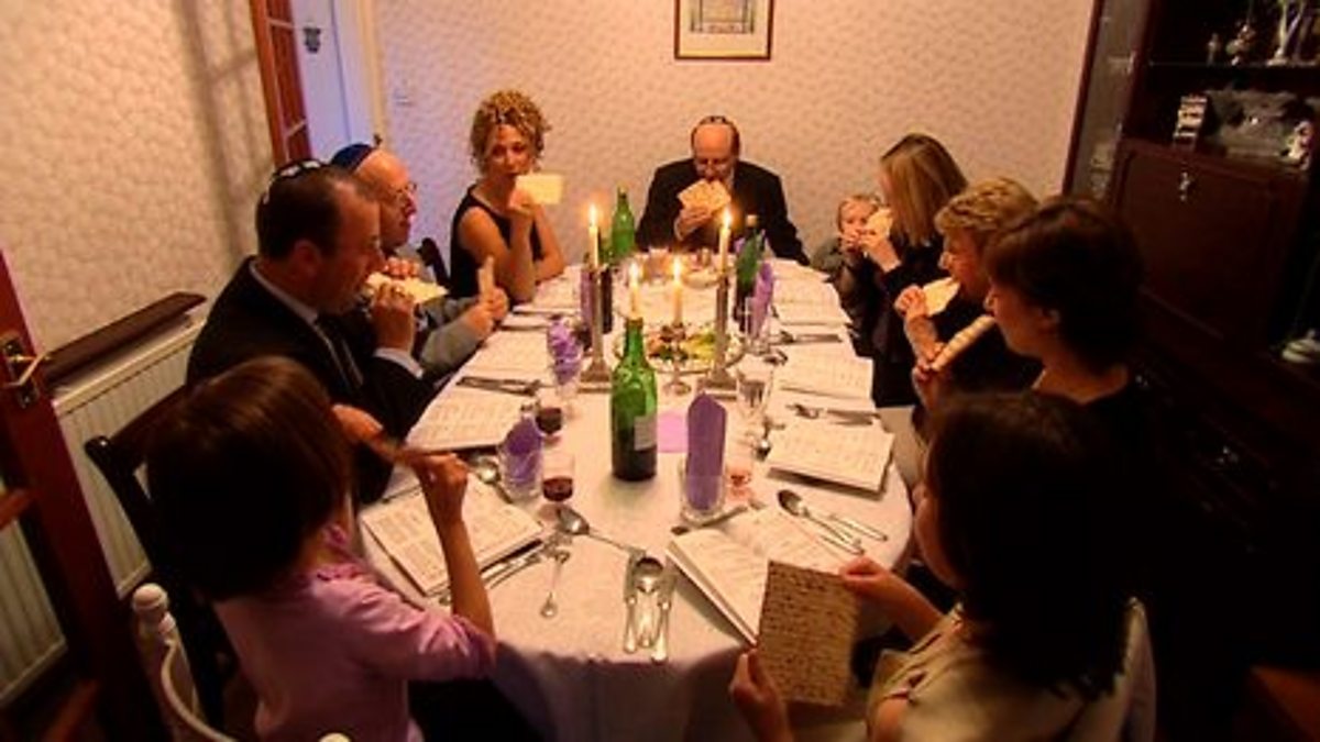 The clip shows a Jewish family celebrating Passover. They discuss the four questions of Passover which help to explain the practices that they follow, for example eating bitter herbs to remind them of the sad times and leaning to the left because they are now free.