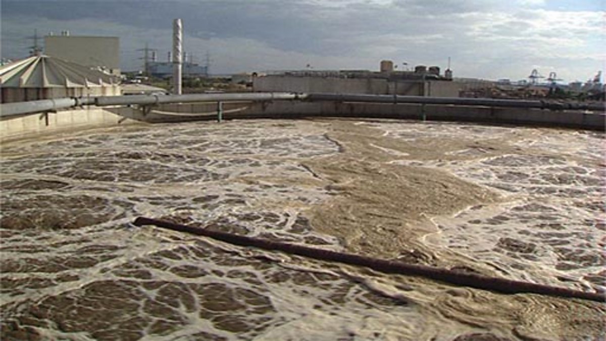 An explanation of how water is cleaned and returned to the sea before evaporating and re-entering the water cycle. The reporter visits a water treatment plant to see the process of cleaning the water, to be returned to rivers. A digital animation shows the journey of the River Derwent into the River Trent and the Humber Estuary at the sea. The water cycle is explained. The report finishes with an explanation of evaporation from the sea.