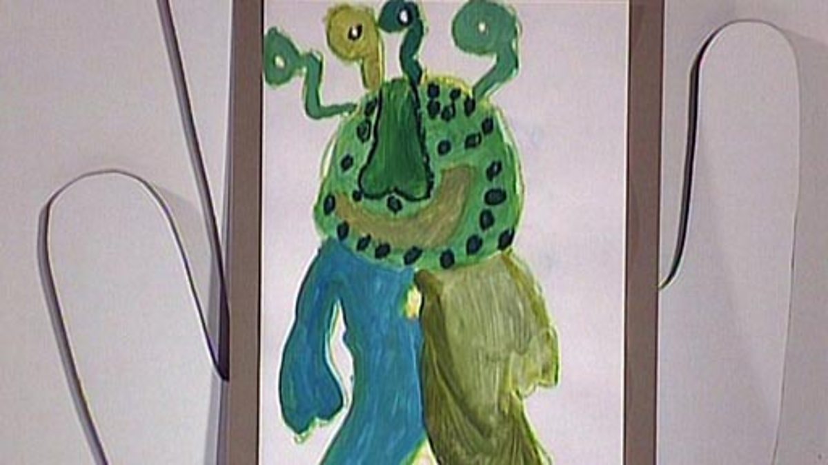 School girl Gloria paints a green monster, colour mixing different greens using yellow and blue paint and finishing detail in oil pastel. The clip includes a handy hint section about the importance of cleaning the brush between colour mixing.