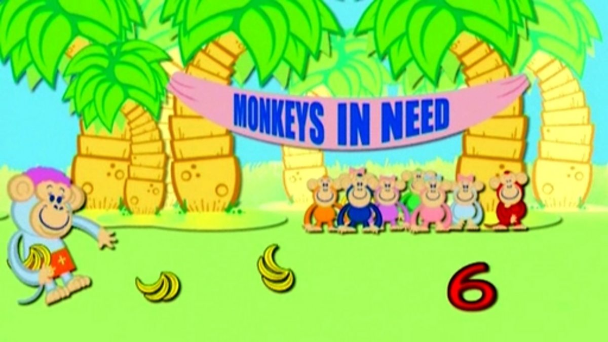 A short animation set in the jungle reinforces counting in threes up to nine lots of three. The naughty monkeys are good for one day a year when they focus on Monkeys in Need. This year they decide to help the older folk by giving them bananas in bunches of three. They pick nine lots of bananas in bunches of three. They share them out before gathering them up and counting them back in again. Reinforces the mathematical concepts and vocabulary associated with the three times table.