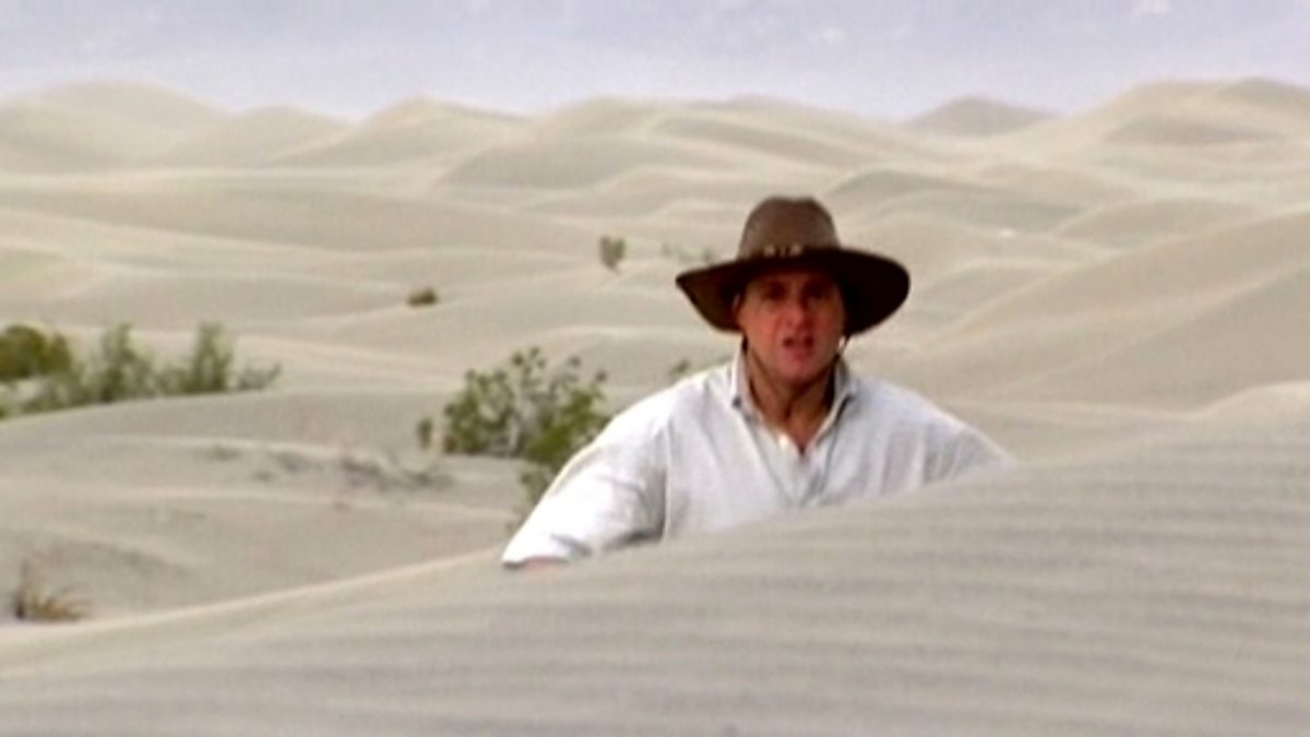 Presenter Andy visits Death Valley and explains what makes up this desert landscape. Sand, made up of tiny rock particles, is blown down the valley and shaped into dunes by wind. Two million years ago this desert was filled with water. When it dried out a crust of salt remained.
