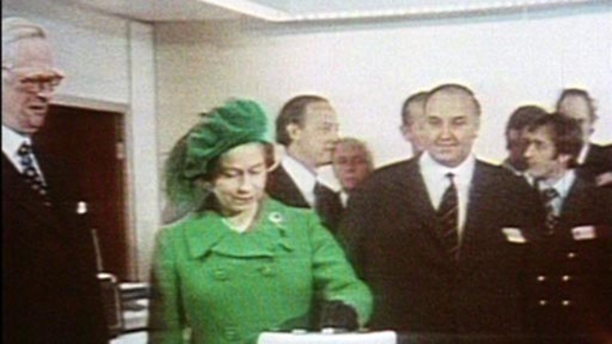 A report about the installation of a new oil platform in the North Sea and its importance to modernisation in the 1970s. A section of the rig is shown being towed across the sea and is then dropped into the water to stand upright. The clip includes the Queen pressing a button to turn on the first North Sea oil pump.