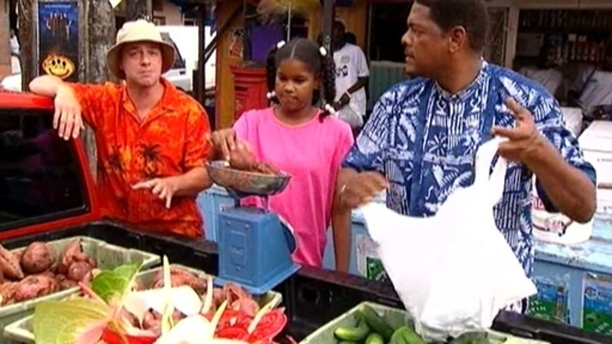 Presenter Andy visits the Friday market in St Georges, Grenada. He tries to sell sweet potatoes and visits a stall to buy local spices. As well as its markets, Grenada has shopping centres and malls that sell a variety of goods.