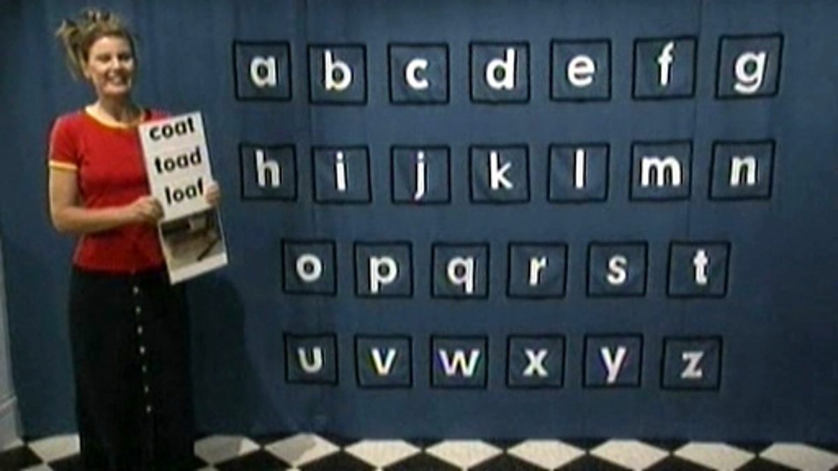 Sophie Aldred demonstrates how to put three 'oa' words - 'coat', 'loaf' and 'toad' - into alphabetical order with the help of a magic curtain and the alphabet song. The words can then be placed into a sound scrapbook.