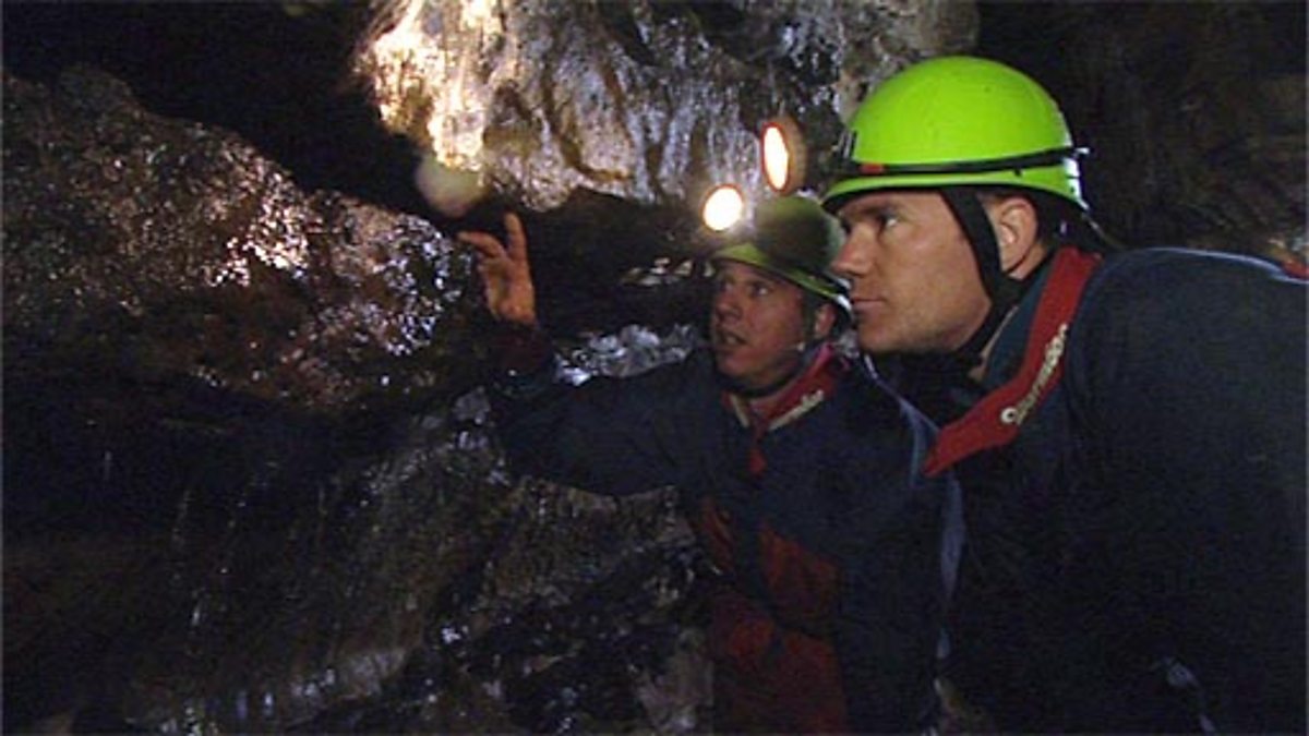 A demonstration of the next process in the water cycle, water seeping through the rocks and flowing into streams, during a visit to the Peak District. A reporter visits the White Peak in the Peak District, potholing to show the groundwater and examining the rocks to show the effects of water flow. Water is seen seeping through the rocks, through a line of weakness and out of the hillside at a spring. The reporter shows the increasingly bigger streams. A digital animation displays the progress of the water cycle from rain to rivers.