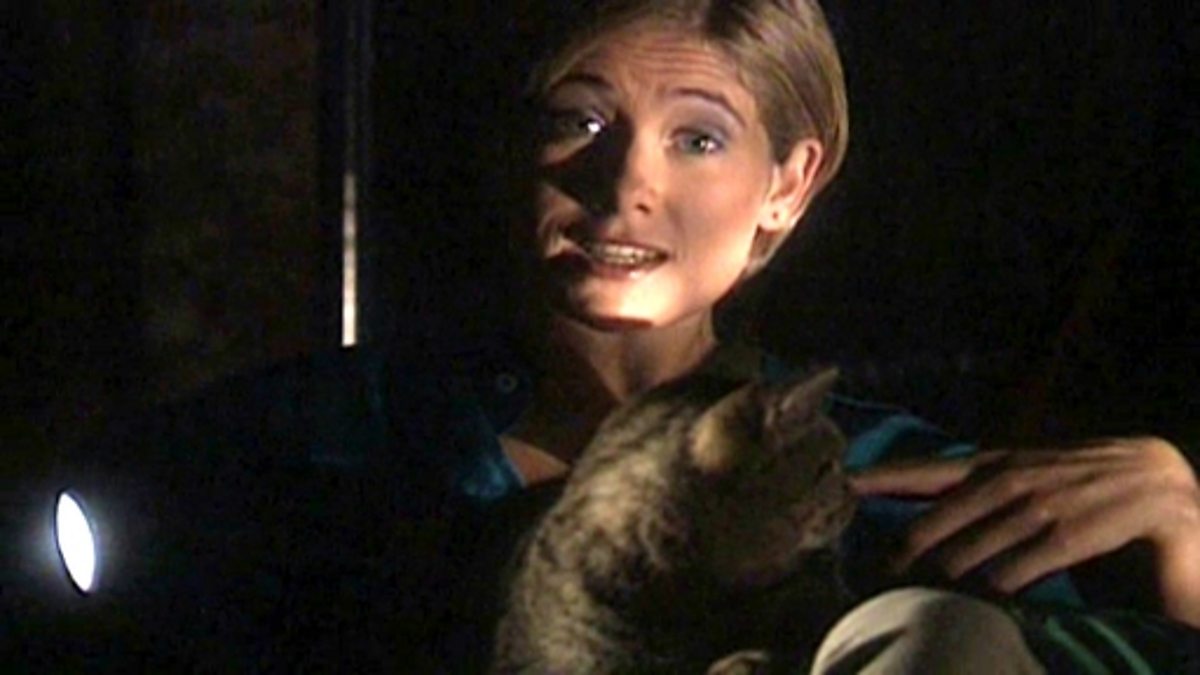 A demonstration of how a source of light is required to see objects in the dark. The presenter shines a torch around a dark room and sees shiny and white objects. The presenter also shows Boffin the cat's eyes shining in the dark. She then turns the torch off and we cannot see anything - a source of light is required to see in the dark. The presenter goes on to explain that Boffin's eyes do not actually glow in the dark and that they simply reflecting the light from the torch.