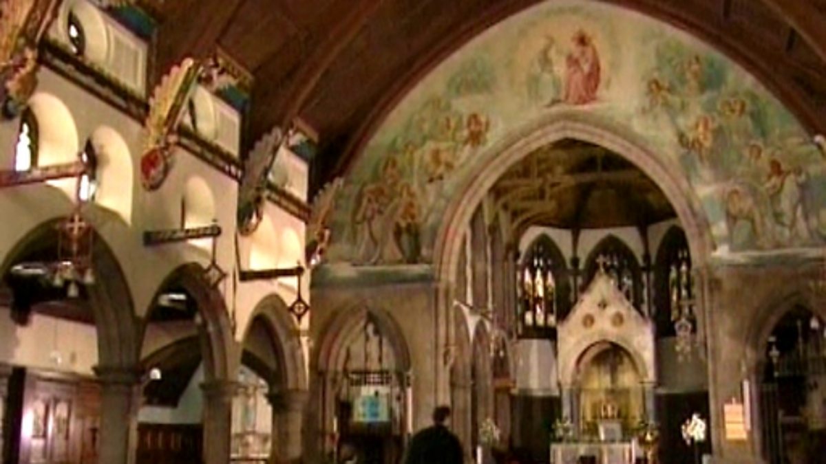 The clip introduces some of the main features of a Catholic Church. A tapestry explaining the importance of Mary to the Catholic Church is featured, and there is a look at statues of some of the saints and stained glass windows.