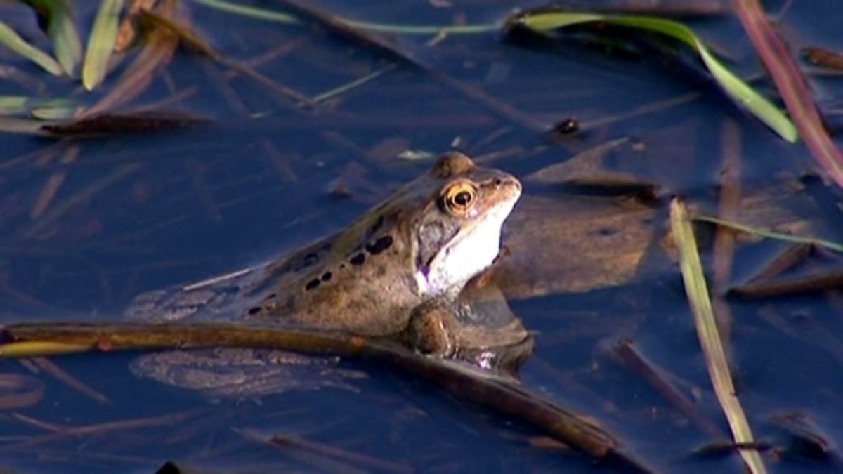 Frogs and toads are seen side by side for easy comparison. Presenter Bill Oddie explains how to tell them apart. Frogs have skin which looks wet even when they are out of the water and a throat which is a whitish colour. Toads have warty looking skin and their overall colour is beige or khaki. There are opportunities for the viewer to identify a series of frogs and toads before labels confirm the answers.