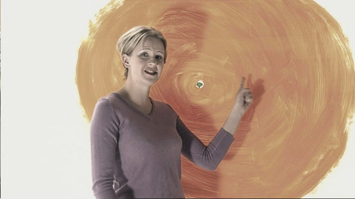 The sizes and numerical facts about the Sun and Earth are illustrated through colourful paintings on a screen.