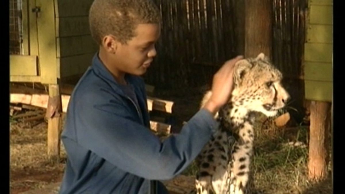An interview with Andy, a young boy who helps to look after animals at an animal home. He talks about feeding a baby cheetah, first on milk and then, as it grows up, on rabbits. Andy explains how the cheetah's coat will change as it loses its baby fur. He discusses with the presenter why the cheetah is groomed.