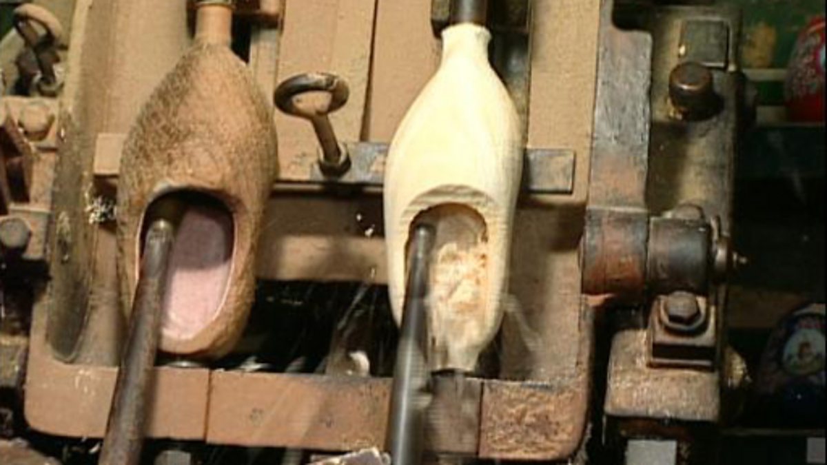 A visit to a klompen factory to find out how clogs are made. Three million pairs of clogs are made in the Netherlands every year. They are worn by people who work in cold, wet or dirty conditions. Although originally hand carved, for the past 90 years clogs have been made using electric machinery and templates, which enable multiple copies to be made.