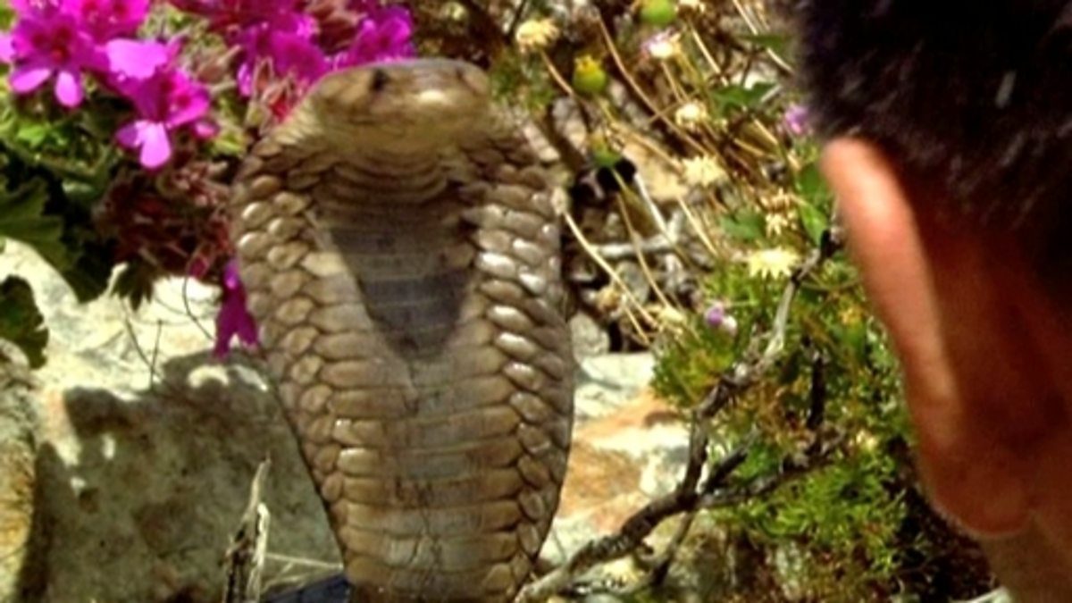 An explanation of how the eyes of the eagle and the cobra help hunt their prey. The eagle can spot its prey from four miles away while the cobra's eyes have light sensing cells. The presenter attempts to approach the cobra without it unleashing a venomous strike, which can kill in minutes. He explains how light-sensitive cells in the cobra's eyes tire in minutes if what they are looking at does not move. He demonstrates this by kneeling in front of the cobra and staying very still. When he moves away from the cobra it attacks.