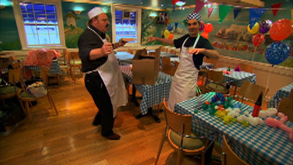 The Grecian pizza parlour boss brings up from the cellar a box of 80 ‘smashing plates’ that must be arranged in piles three deep around the perimeter of the restaurant. The guests will smash them at the end of the pizza party after the dancing. Apprentice Ambrose’s boss explains the difference between area and perimeter. Perimeter is ‘the distance round the outside edge’ and area is the ‘space inside’. Ambrose must work out how many plates he needs and how many boxes to fetch. Ambrose also learns the quick way of finding the perimeter of a rectangle as (2 x length) + ( 2 x width). He measures the restaurant in plates. Three questions of increasing difficulty are asked about area and perimeter based on the pizza parlour scenario.