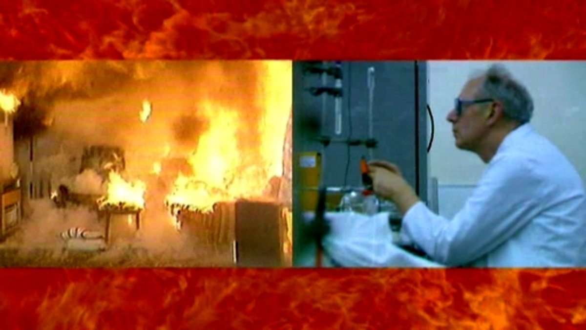 All household furniture fabrics must be treated with fire retardant by law. This safety measure ensures that in the event of a fire the fabric burns slowly and produces very little heat and smoke. Research and testing ensures that the manufacturing industry is kept up to date with the safest materials available. In this film we see how four fabrics – cotton, polyester cotton, silk and fire retardant cotton – are tested for how quickly they burn and how much heat and smoke they produce.